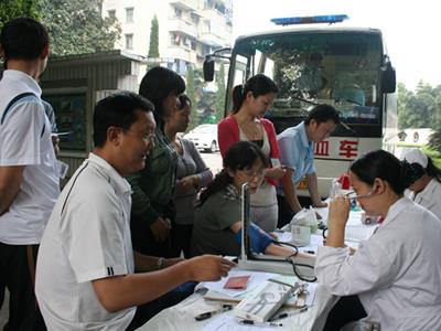 2009年4月23日,樂山市中心血站的采血車開到我公司醫(yī)務(wù)室門口,為公司參加無(wú)償獻(xiàn)血的員工體檢、化驗(yàn)以及采血。